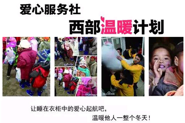 西部温暖计划是由中国青少年发展基金会兰花草艺术基金于2006年发起,旨在通过组织广大志愿者向青海、甘肃等西部偏远山区捐助棉衣及教育物资,呼吁社会对西部欠发达地区人群尤其是青少年群体的关注和关爱。2015西部温暖计划以"坚持,就会改变"为主题,用心中满满的爱去呵护、温暖西部地区孩子们的身心,鼓励孩子们勇敢面对成长过程中的困难和挑战,健康快乐地成长。