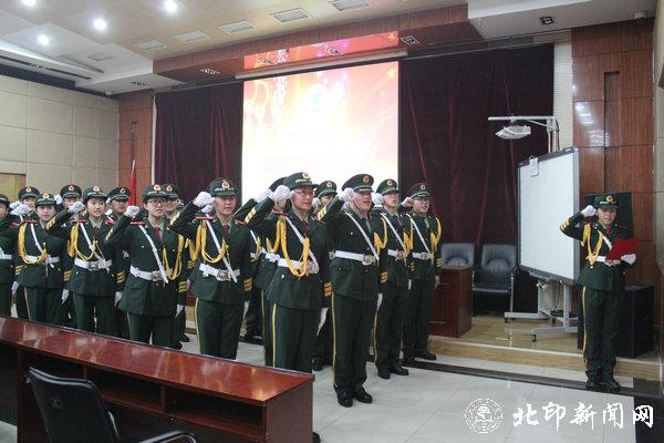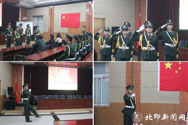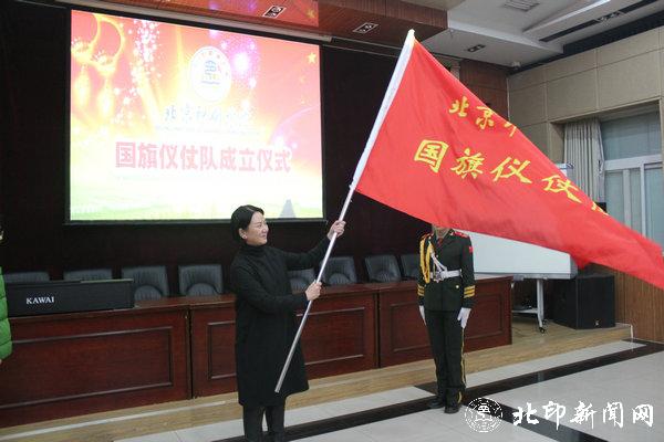 彭红为北印国旗仪仗队授旗。仪仗队全体队员面向国旗庄严宣誓,并展示了训练的成果。石化学院国旗仪仗队成员进行了指挥刀展示。仪仗队队员代表进行了发言。